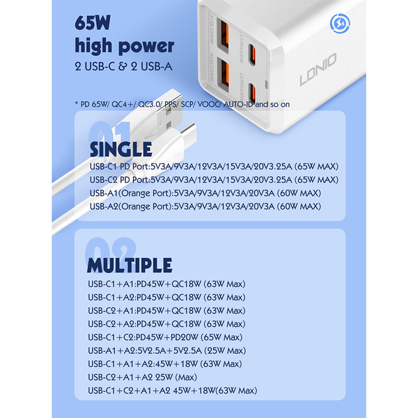 45W+20W 65W MAX 5V/5A 25W MAX PD 45W+7.5W+7.5W MAX |
