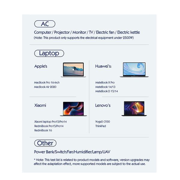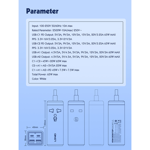 | USB-A2 Outut: | 4.5V/5A, 5V/4.5A, 5V/3A, 9V/3A, 12V/3A, 20V/3A (60W MAX) |