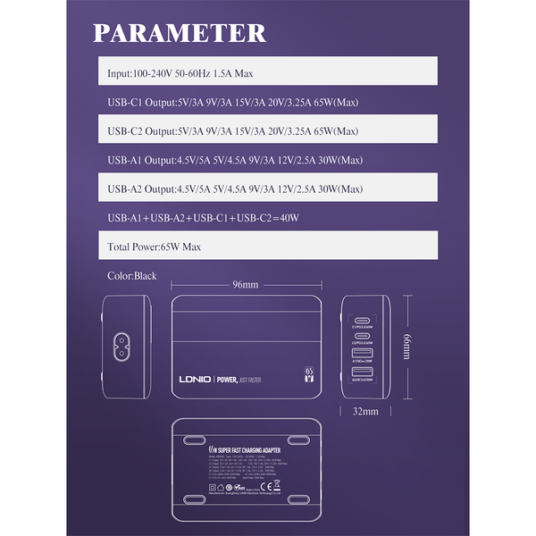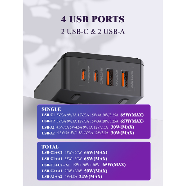 | Output (USB-C1): | 5V/3A, 9V/3A, 15V/3A, 20V/3.25A 65W (Max) |