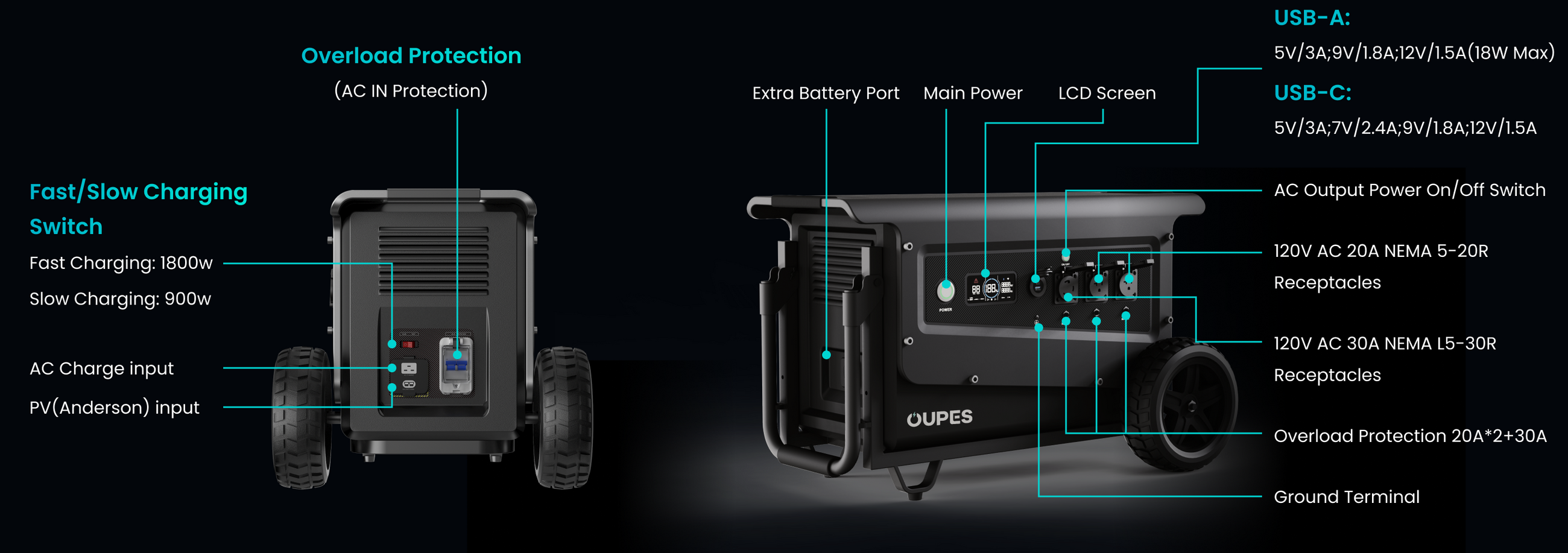 In order to meet the needs of various uses, the Titan series is designed with a variety of different types of interfaces, including 30A for RVs, Overload Protection to ensure safety, and a fast full charge switch button that can quickly switch the charging speed with one button to meet your charging needs in different situations.