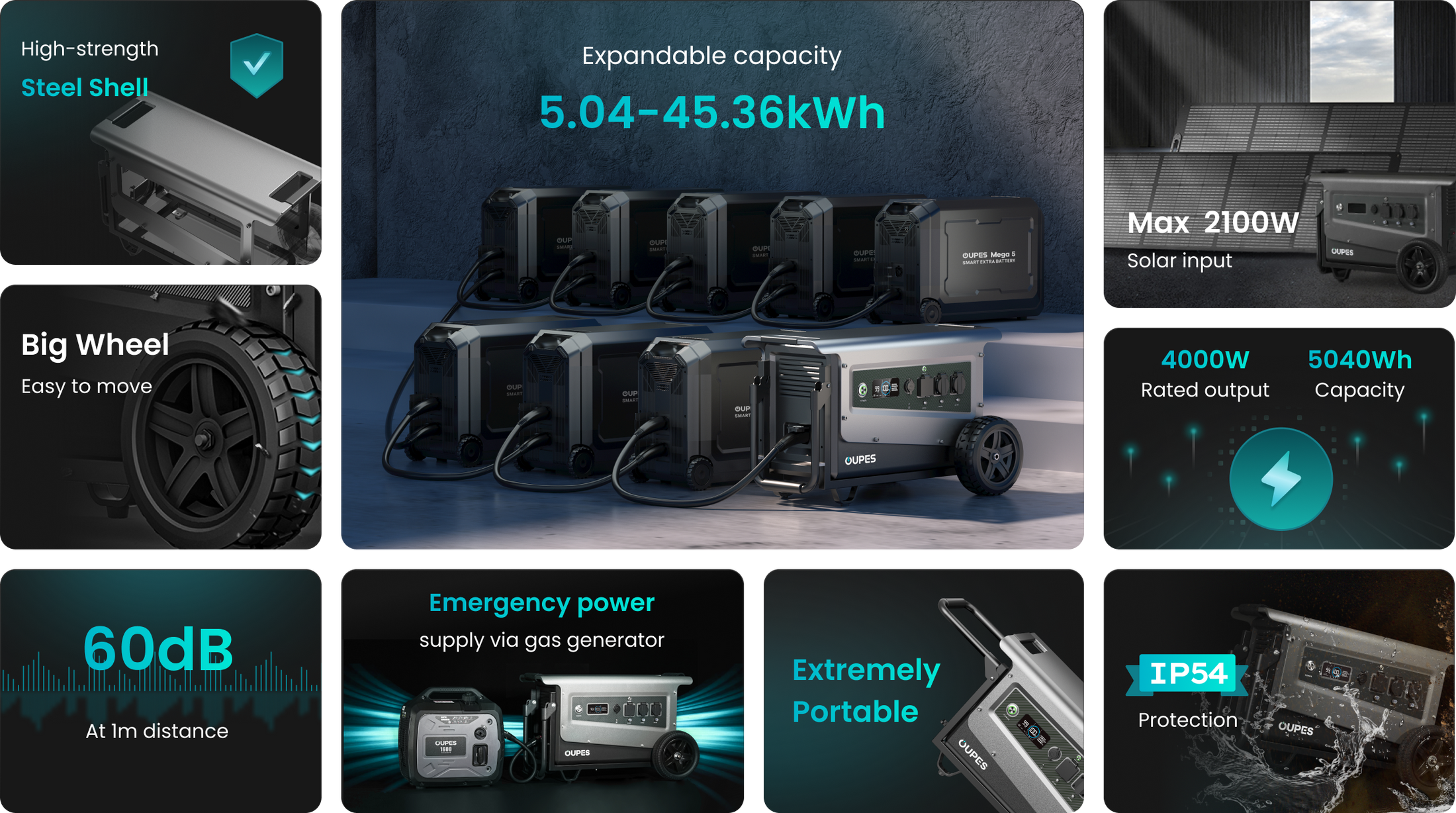 The Titan 5 boasts an impressive 4000W of continuous output power, capable of supporting 99% of power tools on the market, including electric saws and air compressors. With a single-unit capacity of 5040Wh, it also supports expansion with 8 pieces of B5 battery pack, offering up to 45kWh of total power. Its robust design makes it ideal for a variety of applications, including professional work, home backup, and off-grid living.