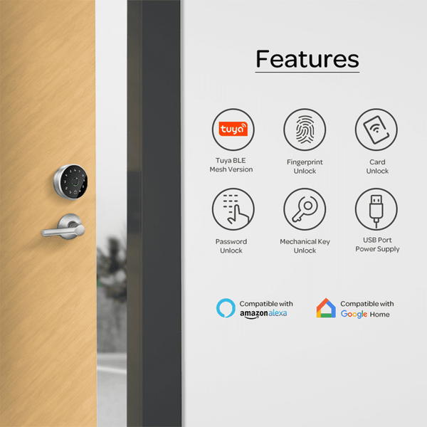 Get that extra security while you’re home or away. Control access to your property from anywhere. Get alerts to your smart mobile devices when doors are open or closed. Add multiple users (permanent or temporary). Get time logs for users, perfect for attendance management. Works with Amazon Alexa and Google assistant for voice control and smart home integration. Providing several ways to unlock. Gateway connection needed for full functions.