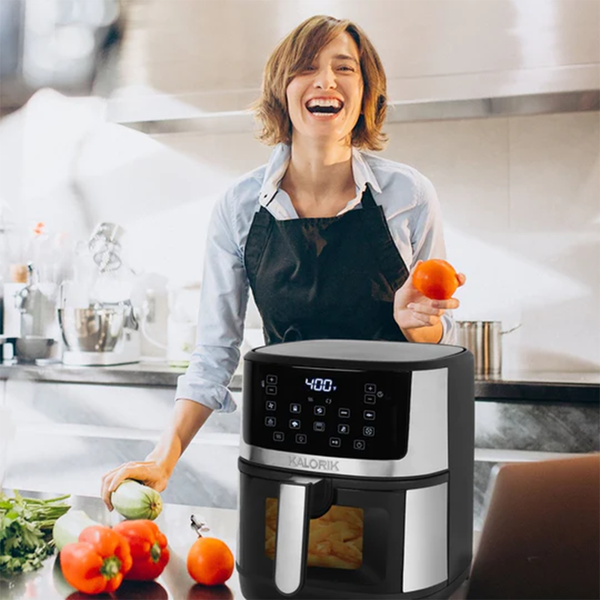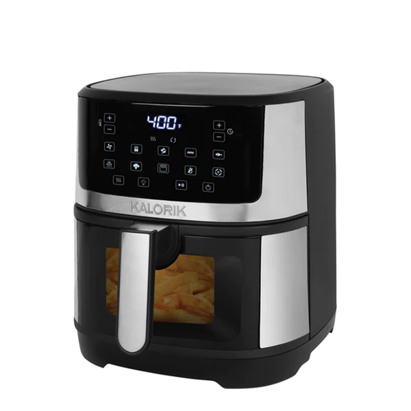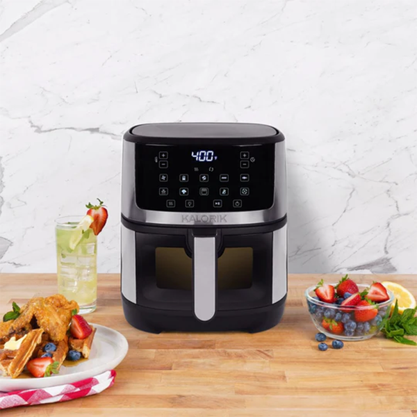 Create crispy, air-fried meals with the Kalorik® 5-Quart Touchscreen Air Fryer. With a brightly lit viewing window for easy monitoring, this machine surrounds food in a whirlwind of hot air instead of oil to create a tender interior and crunchy finish. Enjoy easy digital menu selection, adjustable time and temperature (up to 400°F), and 10 smart presets.