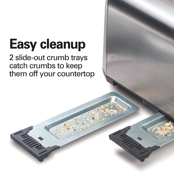 The 2 slide-out crumb trays on this Hamilton Beach bread toaster catch crumbs to keep them off your countertop. Just slide out to easily discard crumbs.