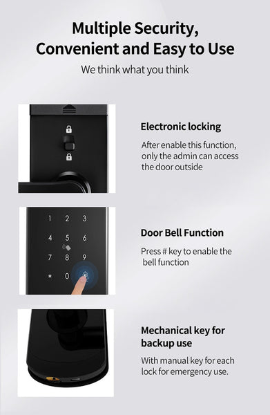 Get that extra security while you’re home or away. Control access to your property from anywhere. Get alerts to your smart mobile devices when doors are open or closed. Add multiple users (permanent or temporary). Get time logs for users, perfect for attendance management. Works with Amazon Alexa and Google assistant for voice control and smart home integration. Providing several ways to unlock, including Door Bell Alert Feature