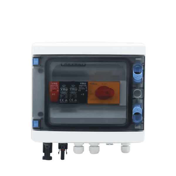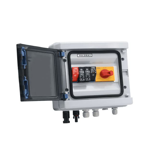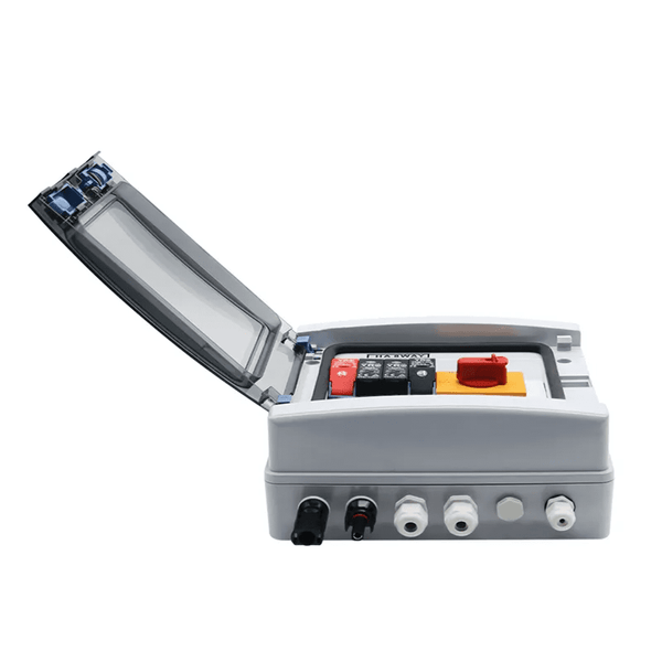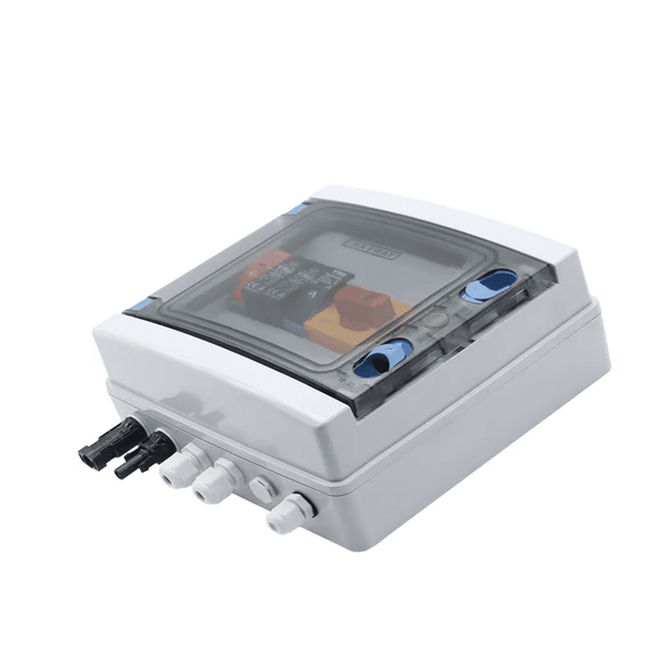 - 15A 1000V 1 IN 1 OUT Combiner Box Complete with Fuses, Breaker, Lightning Arrestor, Isolator & Transparent WP Cover