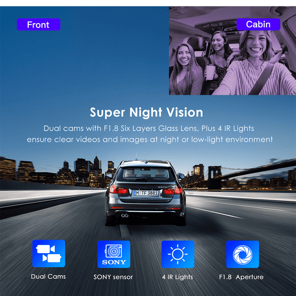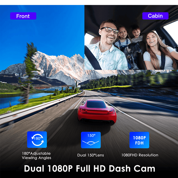 Dual dash cam has both front and internal lens, full HD 1080P Resolution ,150° Wide Angle, both cameras can be rotated at 180 degrees. Capture recordings of whole street ahead and inside the carwith no vulnerable side. Sony focal point guarantee HD clearness picture.