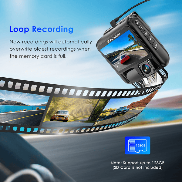 Auto starts up and records automatically when the ignition sparks up, loop recording saves the latest videos and overwrites the oldest videos when memory card is full. Supports up to 128GB card max, please format it on the dashcam before use.